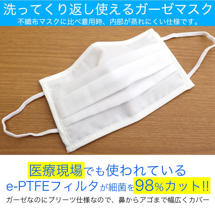 ------------------------------------------------------ くり返し洗って使える無地ガーゼマスク ■医療現場でも使われている「e-PTFEフィルター」採用で細菌濾過効率レベルKN95規格をクリア ■「e-PTFEフィルター」が細菌を98%カット。